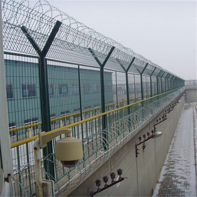 監獄圍欄網也稱為監獄圍擋或監獄隔離欄,它是高強度剃刀鐵絲網和普通防護網的組合。刺刀網是一種新型的防護網,它由鋒利的鍍鋅鋼板或不銹鋼薄板作為葉片,而鋼絲則作為芯線,可以有效的防止人為翻越欄桿的行為。