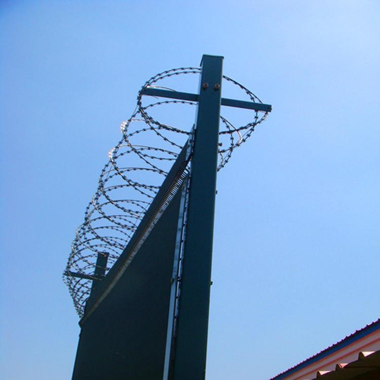 監獄鋼網墻采用高強度的刀片刺網與普通防護網的結合,由V型支架立拄,加強型焊接片網,安全防盜連接件和組成。監獄護欄網網格結構簡練、便于運輸、安裝不受地形起伏限制,特別是對于山地、坡地、多彎地帶適應性極強。螺旋型交叉刀片刺網是在兩條刀片刺網之間以不銹鋼片和鍍鋅鋼片強力夾扣,展開后即呈交叉狀,美觀又實用。