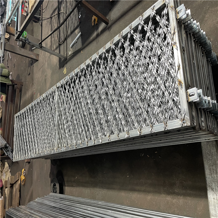 監獄刀片刺網具有美觀、經濟實用、防阻效果好、施工便利等優異特點,刀片刺網由熱鍍鋅鋼板或不銹鋼薄板沖壓出尖銳的刀片狀,高張力鍍鋅鋼絲或者不銹鋼絲做芯線組合而成的阻絕器材。由于刺網造形獨特不易觸摸,因而能達到極好的防護隔離效果。刀片刺網已被廣泛應用于工礦企業,園林公寓,邊防