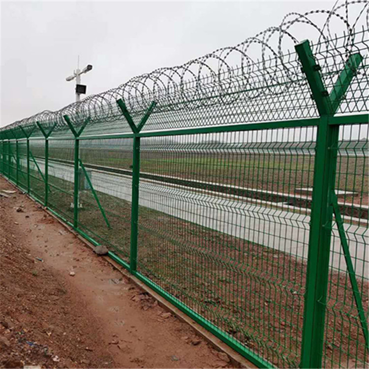 機場鋼筋網圍界具有美觀,實用,方便運輸和安裝的特點。在安裝時地形適應地形,與立柱連接位隨地面起伏可上下調整。
