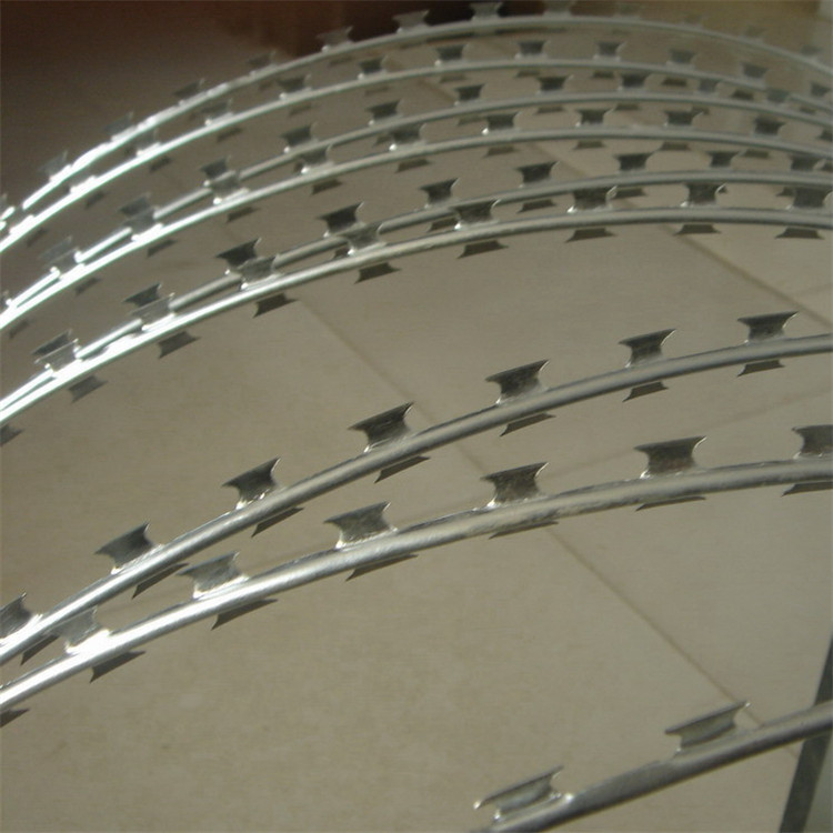 刀片刺絲又名刮刀型刺絲,是一種近年發展起來的防護、隔離能力較強的新型防護網產品。它采用鋼板沖壓成型包附于鋼絲(筋絲)之上,由銳利尖角鍍鋅鋼板或不銹鋼薄板做刀片,高張力鋼絲做芯線組合而成的。鋒利的刀型刺由雙線扣裝后成蛇腹狀,既美觀又讓人不寒而粟。起到了很好的阻嚇作用。該產品具有美觀、防阻效果好、施工便利等優點。
